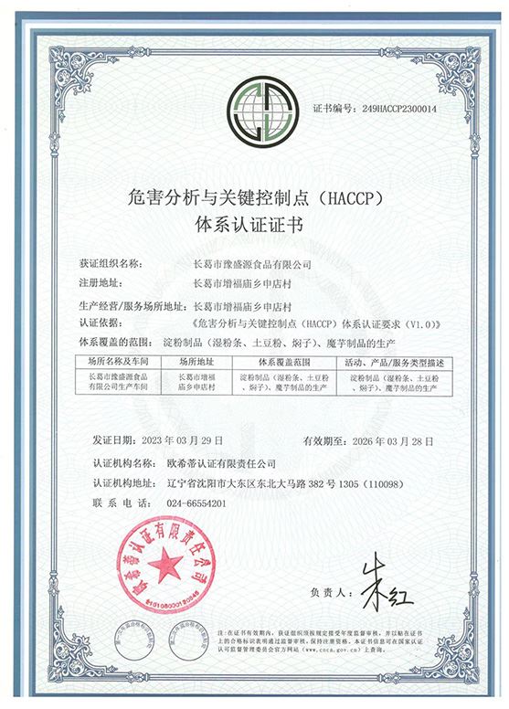危害分析與關(guān)鍵控制點(diǎn)體系認(rèn)證證書
